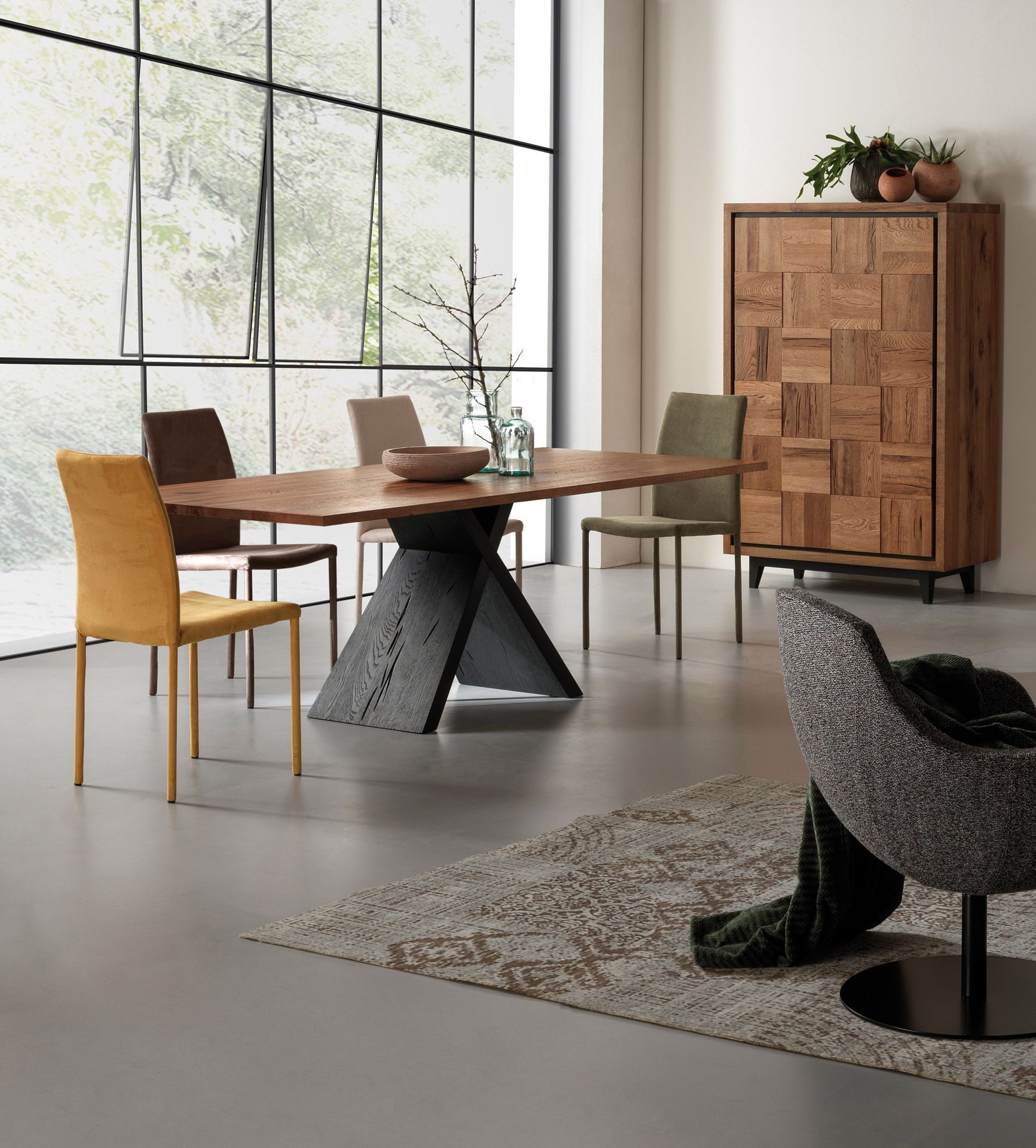 La sedia Buffalo realizzabile in tessuto o in pelle, è possibile abbinarle a qualsiasi tavolo della collezione Wild. Grazie all'alto schienale risultano essere comode e confortevoli, perfette come sedie da cucina.