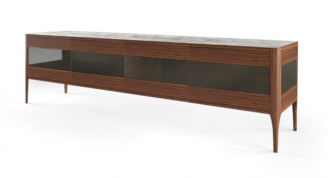 The Luce TV stand is perfect for those who love a 1960s-inspired style, featuring solid wood top, handles and feet and a lacquered MDF structure. For those who want neutral tones, they can opt for a white, black or anthracite lacquer; for those who want to have a more eye-catching piece of furniture, they can opt for a metallic lacquer.