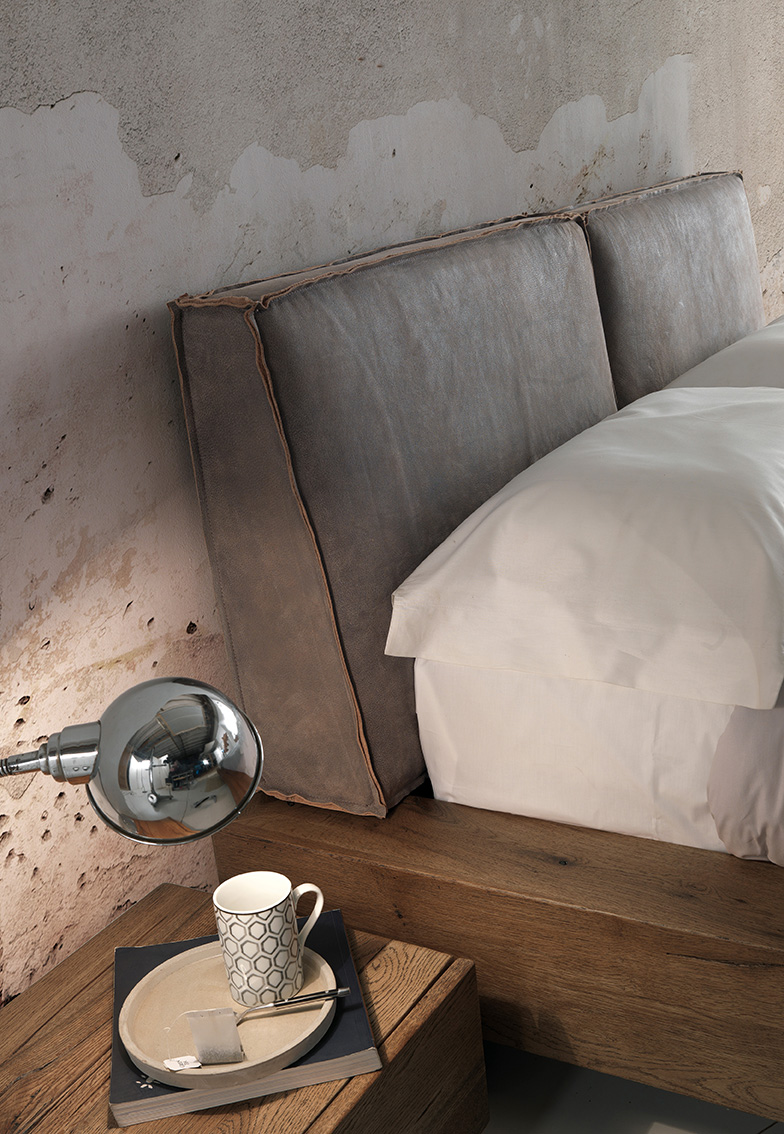 Lasciati sorprendere dalla compatta essenzialità del nostro letto Letto. La struttura in cerro massiccio e la morbida testiera in pelle di bufalo o disponibile in tessuto, uniscono due elementi legati alla natura e generano un effetto dalle atmosfere vintage. Per renderlo più leggero, opta per i piedini in vetro!